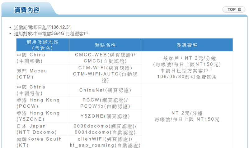 Wi-Fi 漫遊則是 1 分鐘兩元,每日上限 150 元,適用到 106 年底。