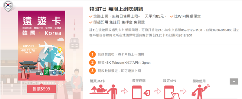 韓國目前是 4 G 上網吃到飽方案,可用 7 天 599 元,一天平均才 85 元,每日流量無上限。