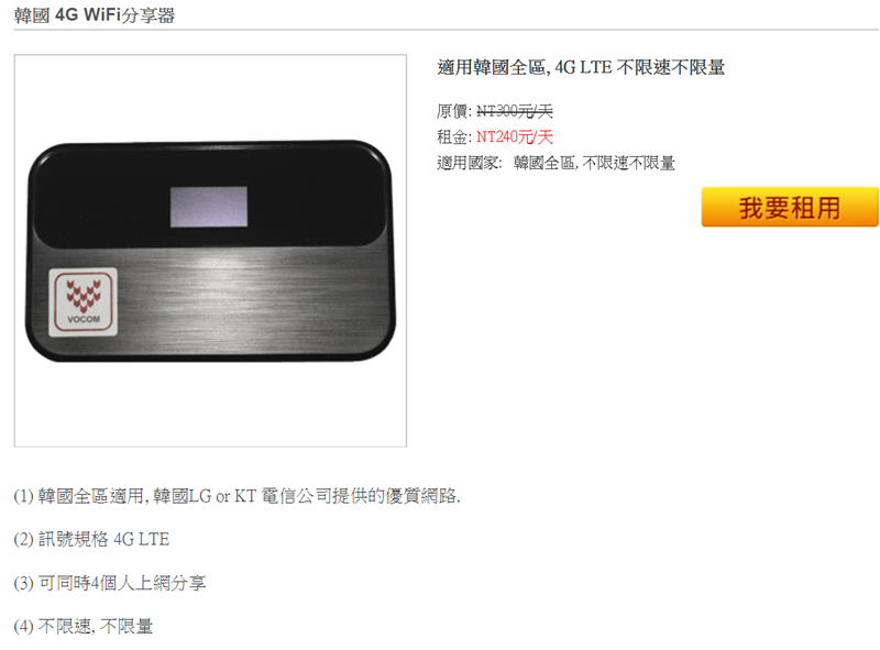 韓國這台可供 4 支手機,一人使用 8 小時,雖說不限速不限量但禁止商業或異常使用。