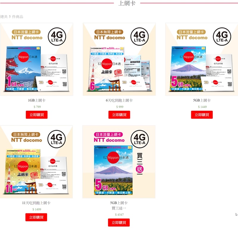 共有五種方案,1GB、5GB、5GB 買三送一,6 天吃到飽和 11 天吃到飽,都是使用 NTT docomo 這家電信,網路上評價不錯,使用也很簡易。
