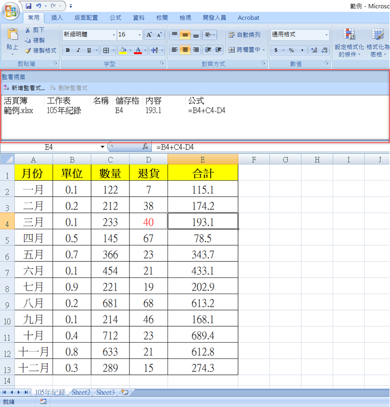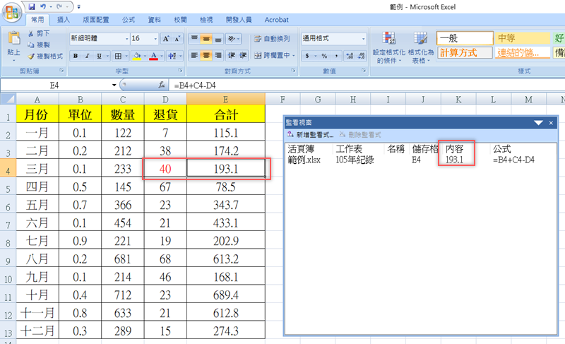 調整大小讓視窗更清楚,活頁簿、工作表、名稱、儲存格、內容、公式都一一列出,當你的儲存格有任何變動,監看內容同時也會更動,像這一個數字原本是 45 改成 40,公式也會一起動到,這樣當你資料越來越多要監視就不用來回比對了。