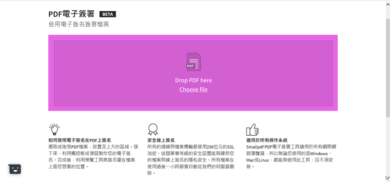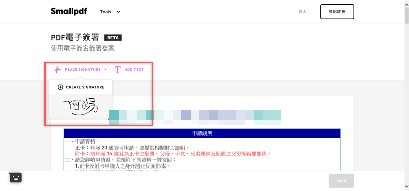 阿湯換用 IE 開啟網頁,果然又可以用了(後來試過用 Chrome 開啟無痕分頁也可以),來試試電子簽署,目前還是 Beta 版,一樣加入檔案。