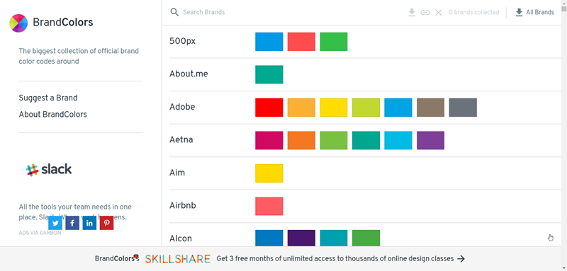使用很簡單,首頁依英文字母排列名稱並列出一張張色票,可以看到像免費圖片網站 500px、軟體商 Adobe、訂房網站 Airbnb 都有收集。