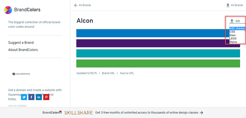 上一頁點「Permalink」就會進到這裡,右上角有提供連結或是選擇檔案類型下載,有 ASE、CSS、Sass、LESS、Stylus 四種格式可選。