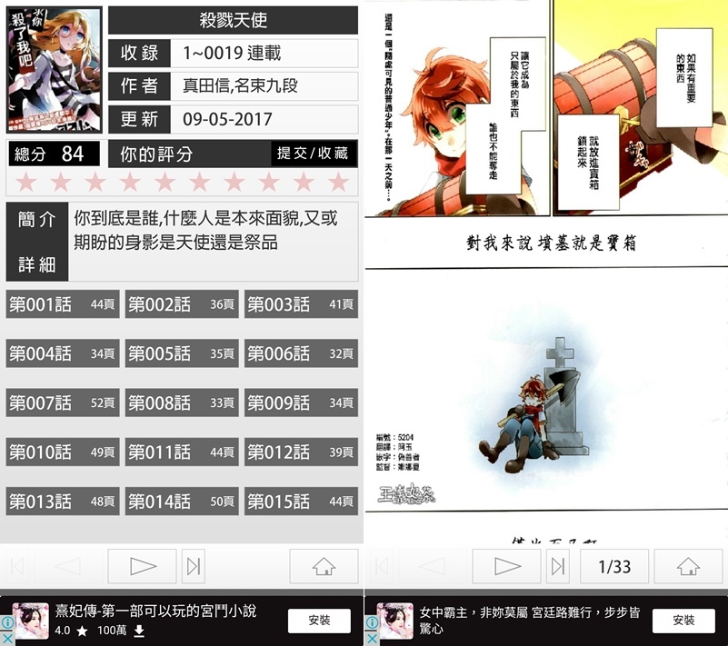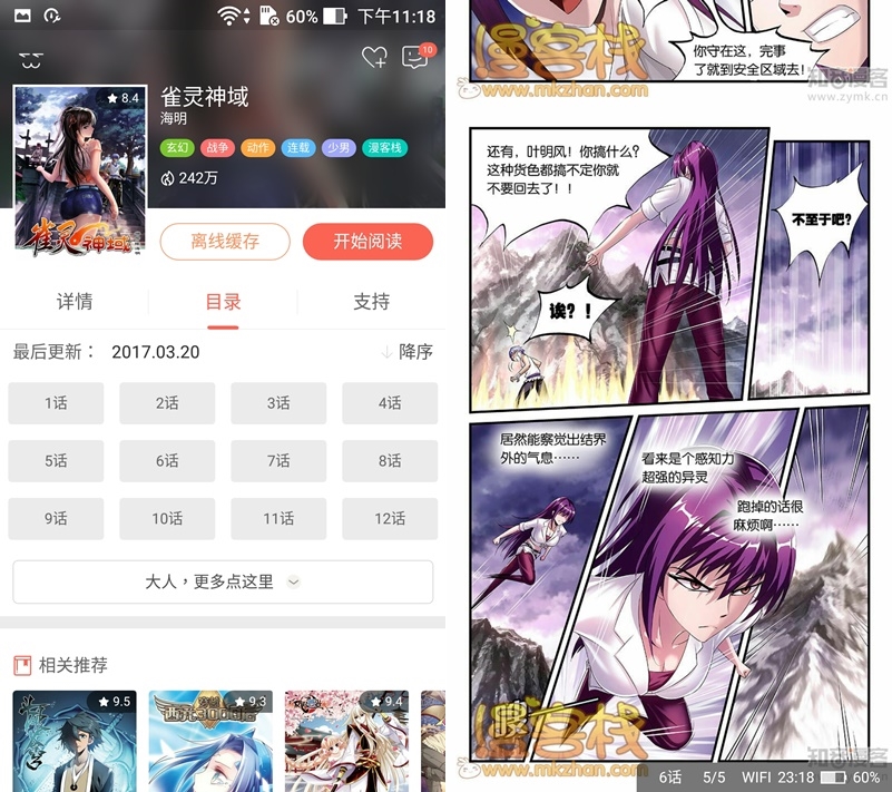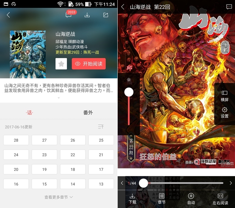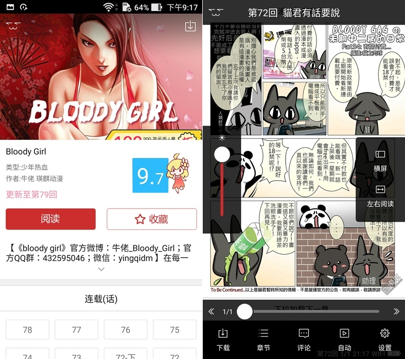 可離線閱讀,也可點標籤迅速找相同題材,可調整畫面亮度,也有橫屏、左手模式,畫質還 OK,只是簡體字比較多。