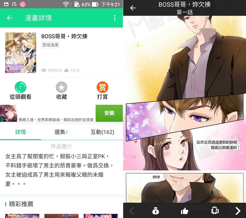 內容以少女漫畫較多,也有一些懸疑恐怖、冒險動作類,不過有些要註冊獲得閱讀券才能繼續看,往下滑動開始看,看了幾本覺得畫質超好而且都是彩色頁面,讀起來很舒適。