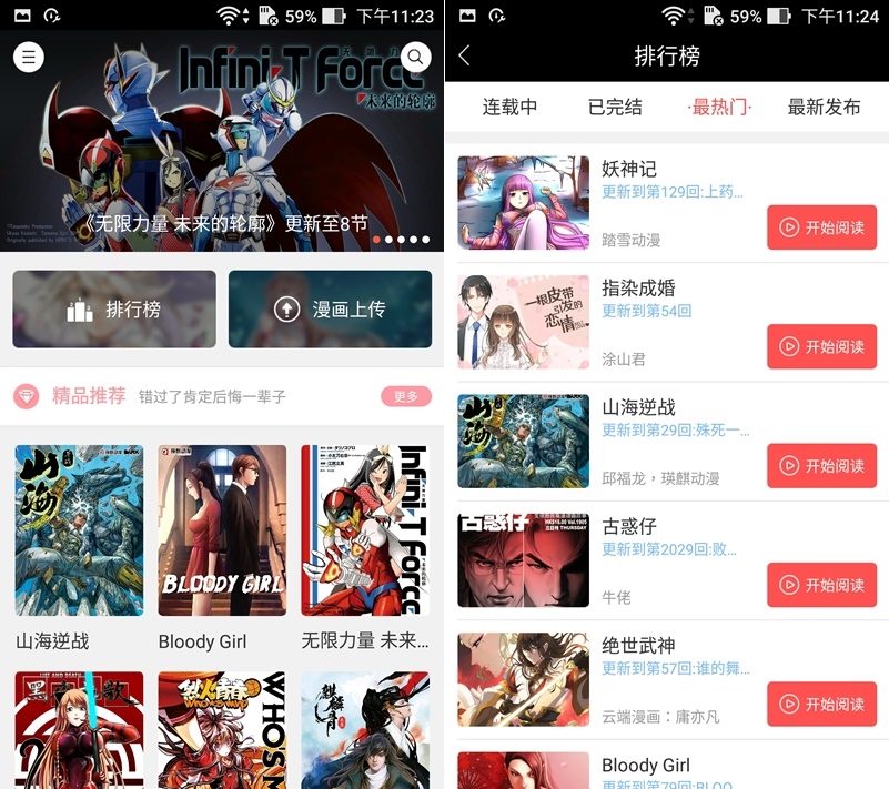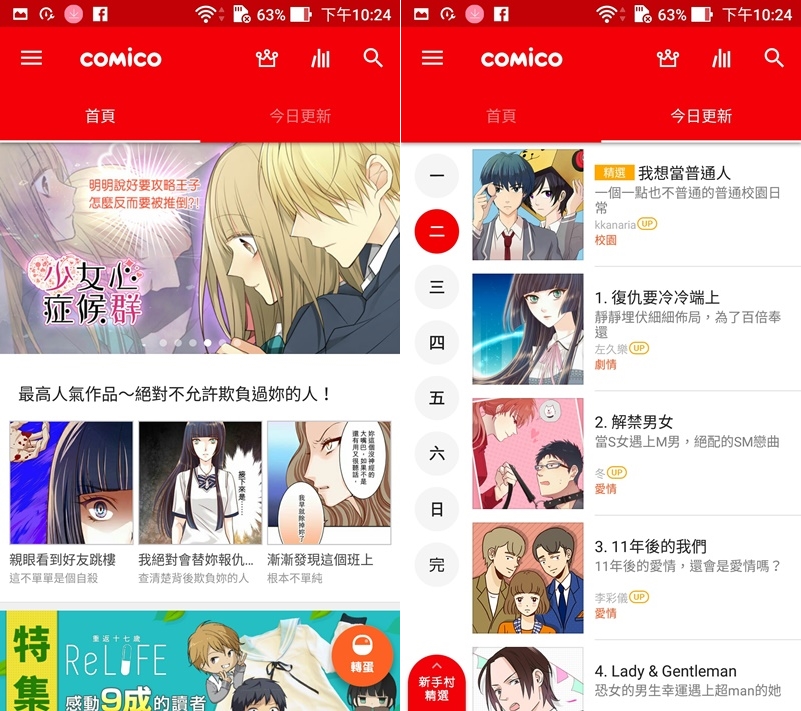 介面的分首頁和今日更新,如果有再追某一部漫畫就可從更新頁開始看,點左上角圖示可看排行榜。