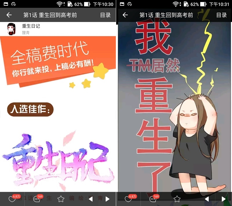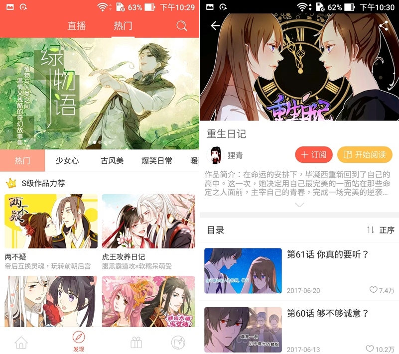「古風」類別都是大陸作品,例如「重生」開頭的都是,閱讀也是往下滑,左滑可切換章節,也可加最愛、討論區,畫質很棒而且也都是全彩畫面,可惜無法放大。