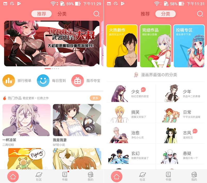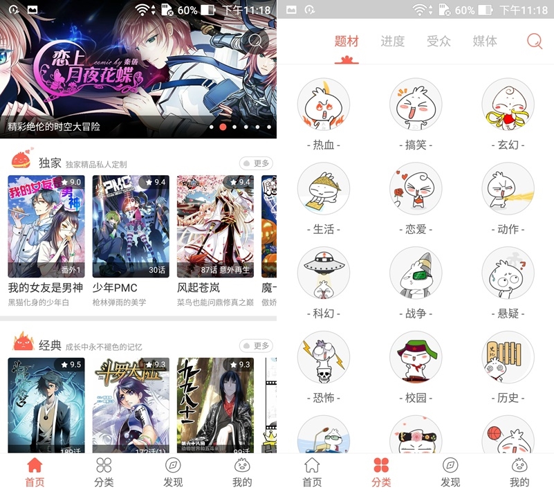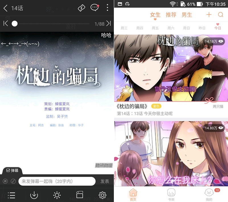 騰訊本來就是以視頻為主,所以跟視頻一樣看個漫畫還有彈幕可以和大家邊看邊討論,很特別,當然也可以關掉,類別則是依男女分。