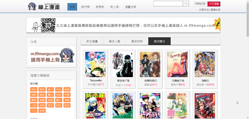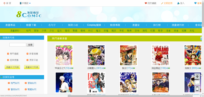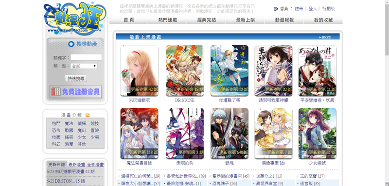 逛了一下應該是目前內容最豐富的網站了,依分類、排行、關鍵字搜尋都找到很多本,登入才可收藏漫畫。