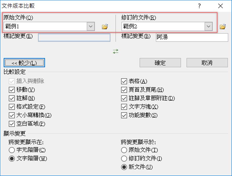 選擇原始文件和修訂的文件,預設的「比較設定」是全部打勾,你也可以將不需要顯示的選項取消勾選,顯示變更的區域也能自行調整,如果維持「新文件」不變,待會就會新增一份「比較」專用的 Word 檔。