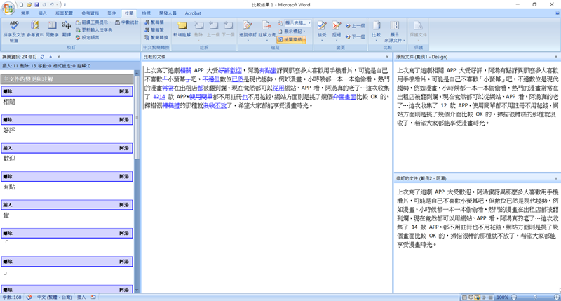 點確定後自動開新檔案,中間是兩份文件的比較結果,並以藍字顯示修改的地方,左邊欄也詳細記錄了修訂的數量與資訊,右欄則是列出兩個檔案方便觀察。
