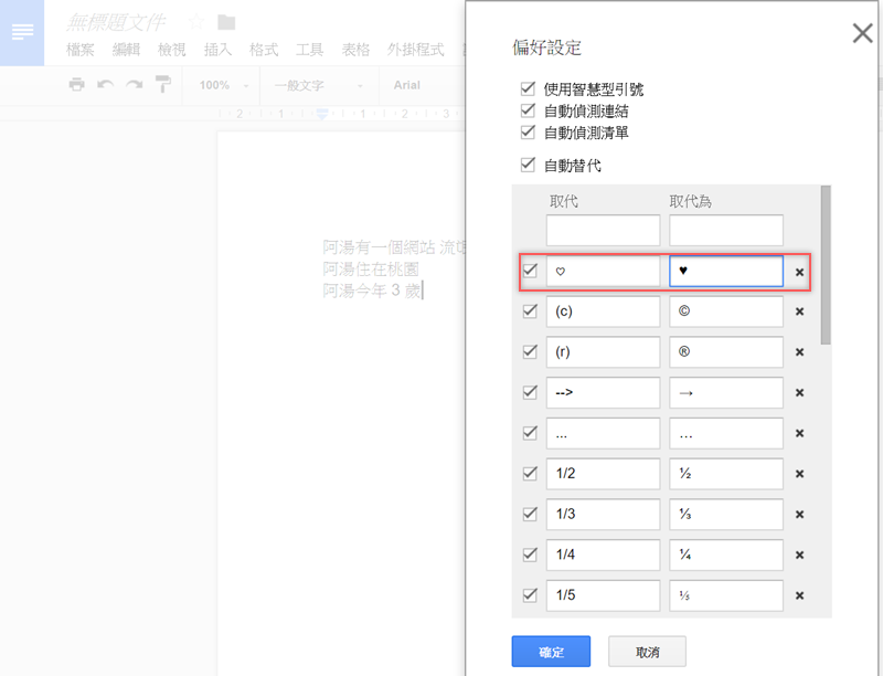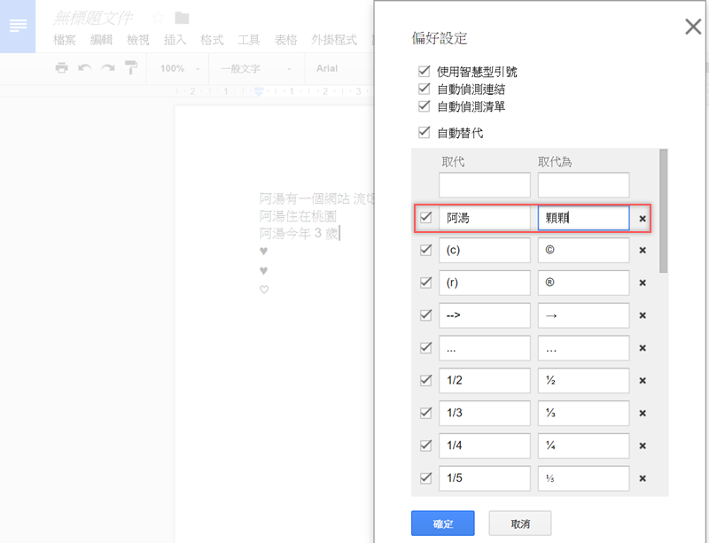 接下來只要你輸入「阿湯」,再按「Enter」,就會變成「顆顆」了,但這項功能是針對你設定之後再增加的內容,已經打上去的文字是不會更動的,跟電腦裡的 Word 先尋找後取代不太一樣。