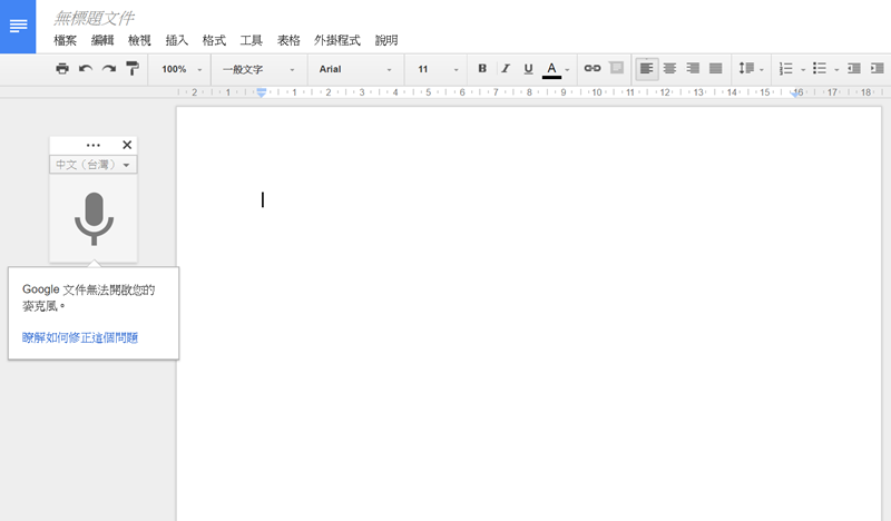 既然萬能的 Google 大神可以用語音輸入,那這項功能運用到相關的 Google 文件也不稀奇,在上方工具選「語音輸入」。
