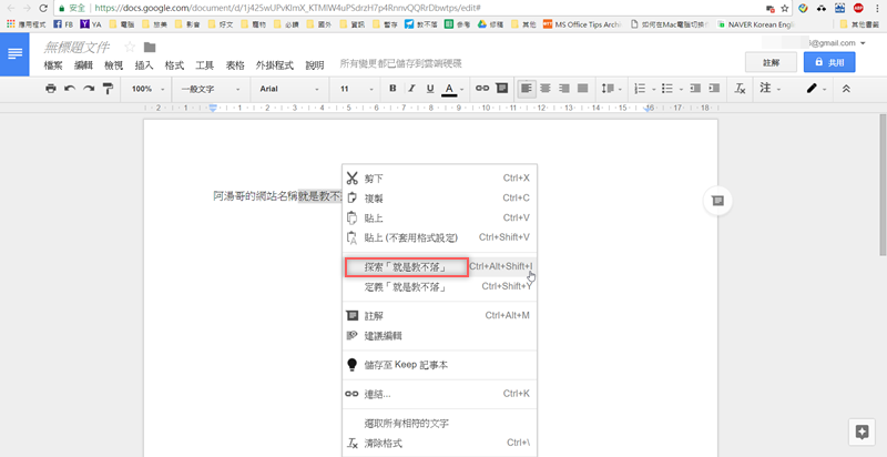 再來就是文件內容如果有需要搜尋的字詞,不用另外再開一個分頁,例如阿湯要找「就是教不落」,只要選取文字,按右鍵「探索就是教不落」。