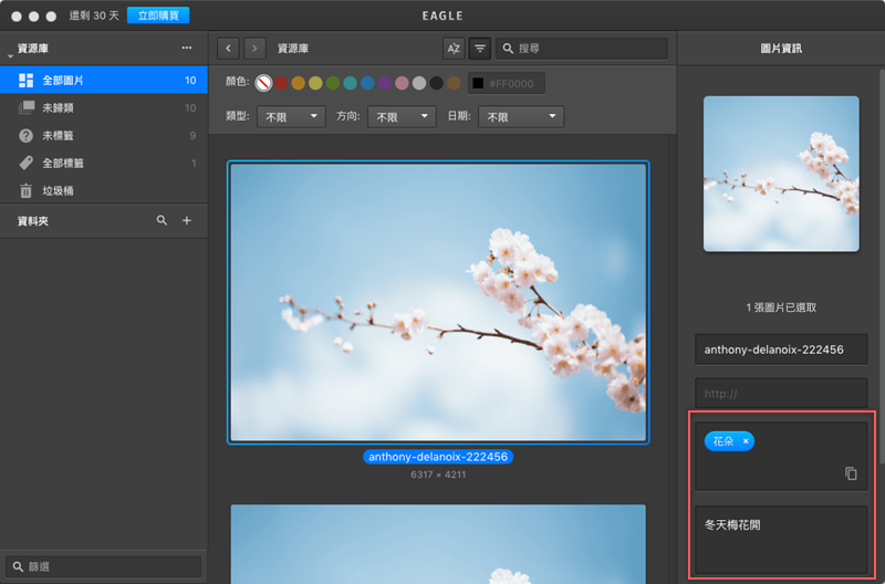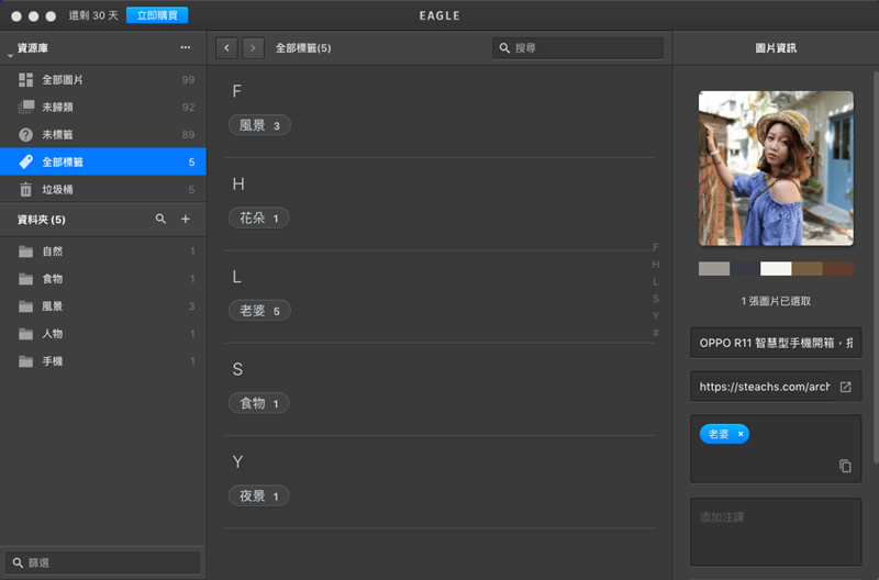 加入標籤可以更快速分類,以往看到圖片蒐集網站都會有標籤搜尋,現在自己電腦裡的圖片也可以用更智慧的方式來管理。