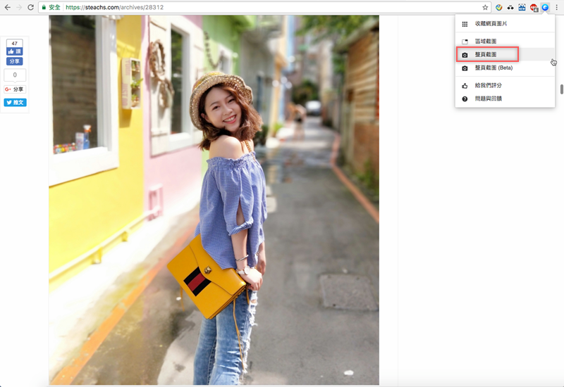 共有收藏網頁圖片、區域截圖、整頁截圖三種功能,點整頁截圖就會一直往下捲動目前看到的網頁,但這功能目前只是 Beta 版,阿湯試用的時候有幾次會卡住。