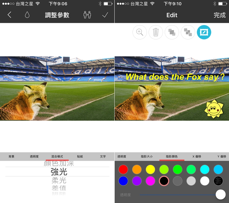 除了透明度,還有 PS 的混合模式,包括正片、濾色、變暗、疊加、差異、柔光、線性加深等等,阿湯選擇強光,然後再加入貼紙、文字,文字和陰影的顏色,陰影的大小、位置都可調整。