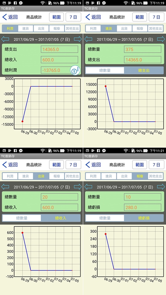 最後來看統計區,請原諒阿湯只有示範一天,所以曲線圖才會變成這樣,顯示範圍可調整成單日或 7、15、30、90 日的紀錄,並可切換觀看利潤、進出貨、報廢的狀態,包括總收入、支出、利潤、以及報廢所造成的虧損都會呈現在圖表中。