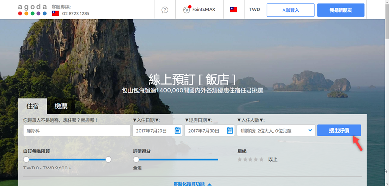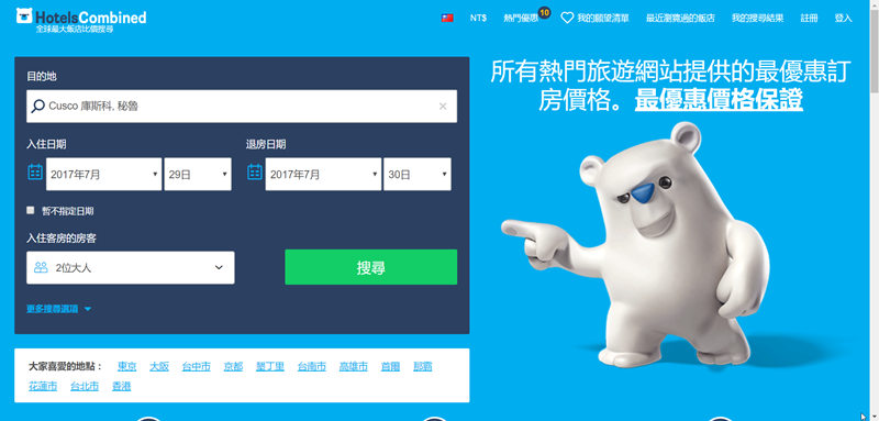 阿湯用過才知道這個網站跟 trivago 一樣都是提供比價平台,再幫你連到實際訂房的網站,首頁輸入訂房資料直接搜尋。