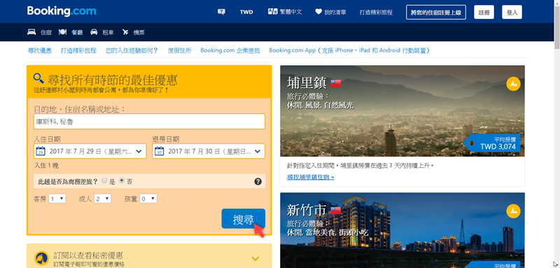 首頁編排有點花,除了左邊的訂房資訊輸入外,還有訂機票、租車連結,往下滑也有一些熱門和推薦的地點,十分豐富。
