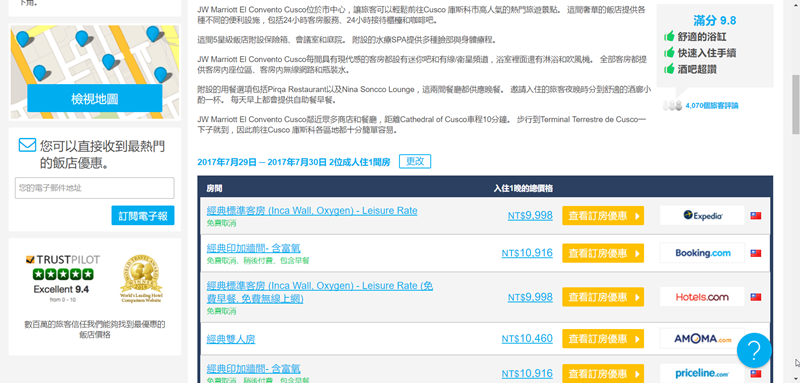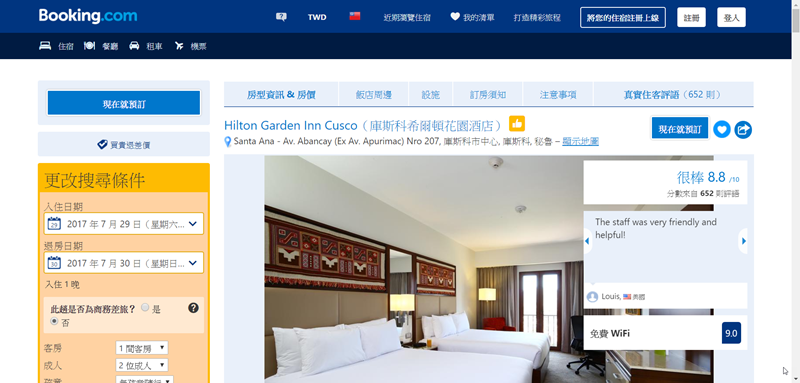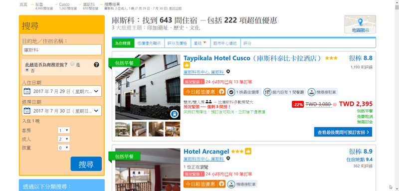 阿湯特別挑了一個不太熱門的地點來示範:秘魯,並以「庫斯科」城為主,那裡有世界文化遺產「印加帝國」的遺跡,並選擇一個月後的周六入住,首頁直接輸入住房資料,並看要不要依預算、評價、星級篩選。