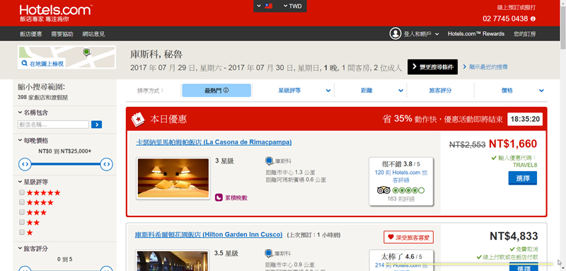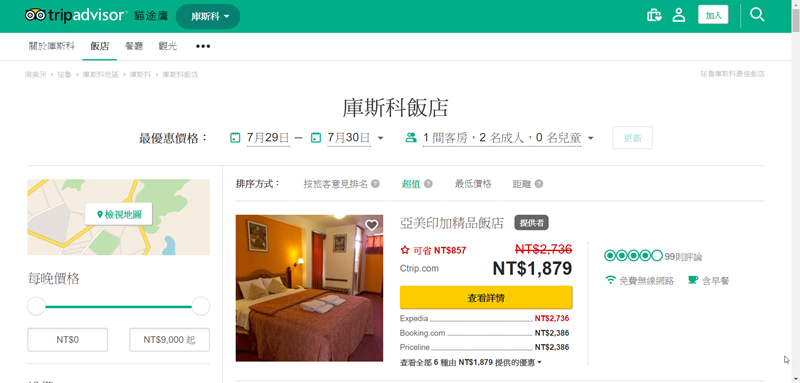 這次搜到的稍微少了點,共 398 間飯店和度假屋,第一項還有限時優惠,圖片旁依次顯示星級、距離、還有在「tripadvisor」的評論(下面會介紹),其他頁面功能都大同小異。
