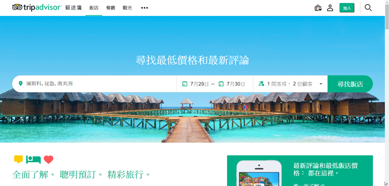 這個貓頭鷹 LOGO 真的很常見,有時只是要看一些餐廳評價或觀光景點介紹也會進入這網站,跟 Agoda 一樣首頁先是大大的搜尋列,下面才是其他推薦。