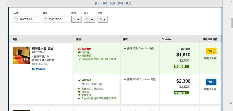 網頁排版都差不多,該有的飯店基本資訊都有,到房型選擇區,除了 Expedia 網站不收預定手續費這點相同外,每個房型的取消和退款機制也是不一樣的。
