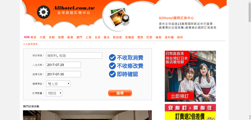 最後這個網站這目前介面設計最不好看的,一度讓阿湯懷疑真的可以訂房還是只有比價功能,不過是真的可以,還標榜不收取消費、修改費、即時確認。