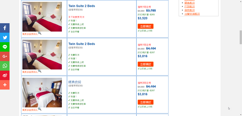 不過這個網站是以「比價」為主,實際訂房還是會連到其他網站,例如這間,點項目會先顯示地圖、飯店設施、房型與規格等。