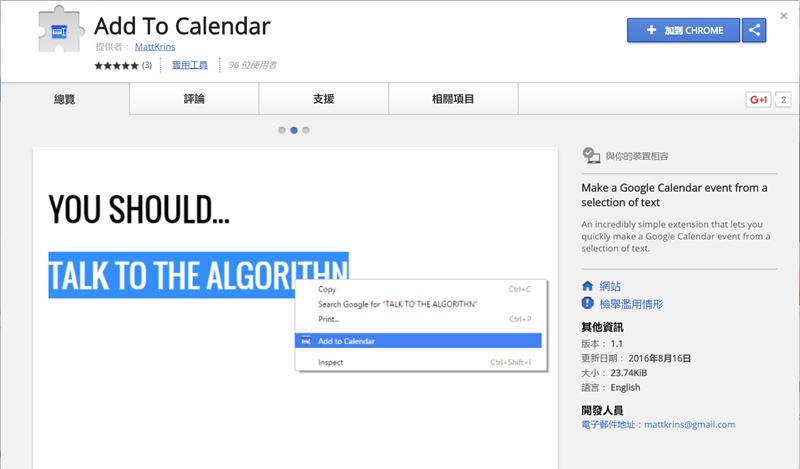 如果你也是 Google 日曆的愛用者,應該恨不得把所有應該記得的事情通通加進去吧,畢竟人的腦容量有限,一定需要東西輔助啊,但身為每天瀏覽無數網頁的電腦族,很多時候是逛網站看一看,發現有需要記在行事曆的事項,這時可以使用「Add To Calendar」這個 Chrome 擴充套件,直接按滑鼠右鍵加入 Google 日曆,就不用另外開網頁重新打字,或者手機拿出來輸入 APP 了,超方便。
