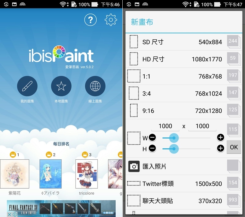 這款 APP 的好處是支援雙版本,如果用平板應該更好畫,使用者評價也蠻高的,因為是以分享創作平台的概念,下載後可看到排行榜和線上圖集,點「我的圖集」就可新增畫布,尺寸非常多樣化。