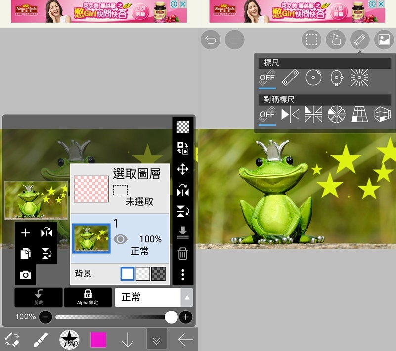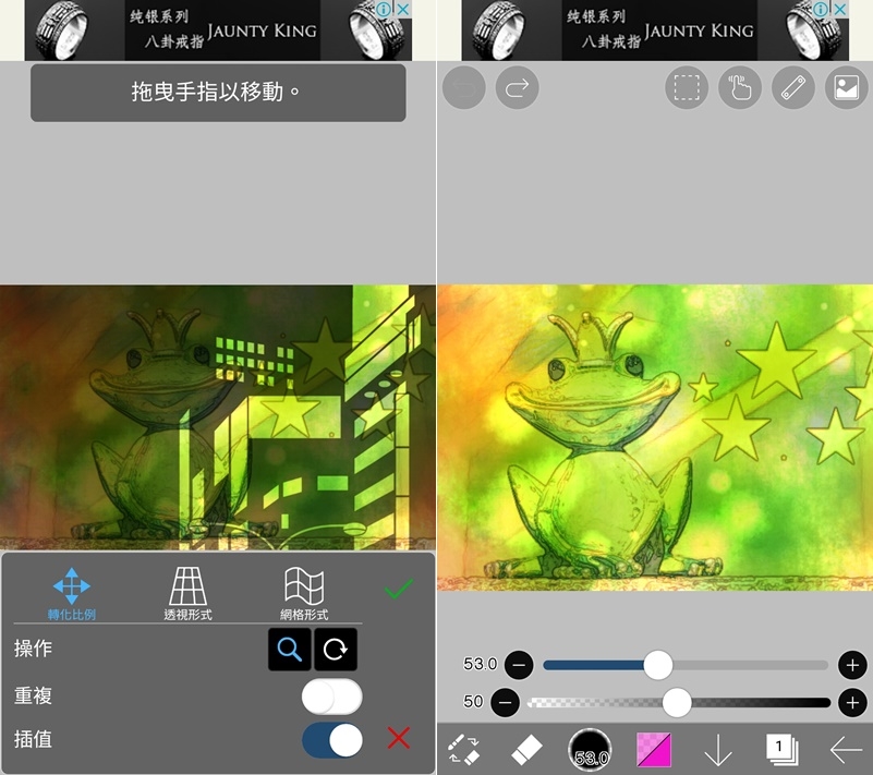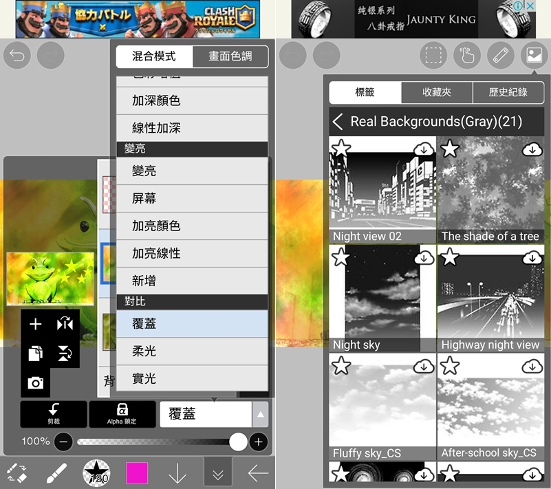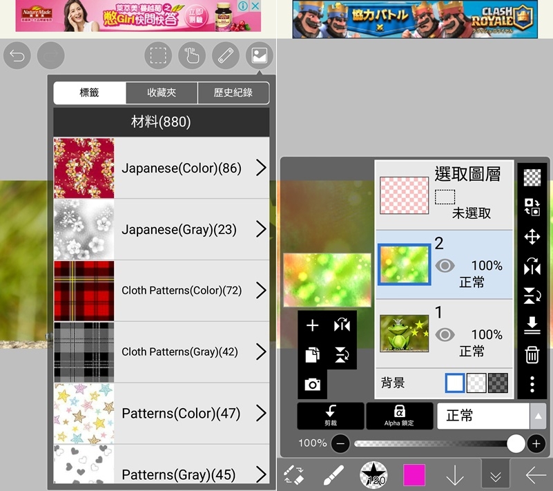 背景素材也能選擇以不同形式加入,其實 APP 裡很多功能阿湯都沒聽過也不太會用,所以最後只能弄個插畫風的青蛙,有接觸過相關軟體的人一定知道怎麼用啦,阿湯就不獻醜了。