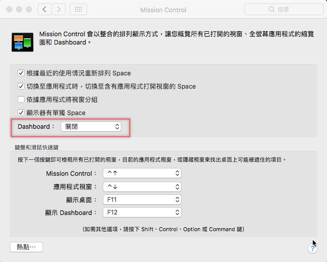 第四種,關閉儀表板,這招可避免顯卡出現問題,尤其比較老舊的 Mac 版本,打開設定到 Mission Control,確定「Dashboard」關閉。