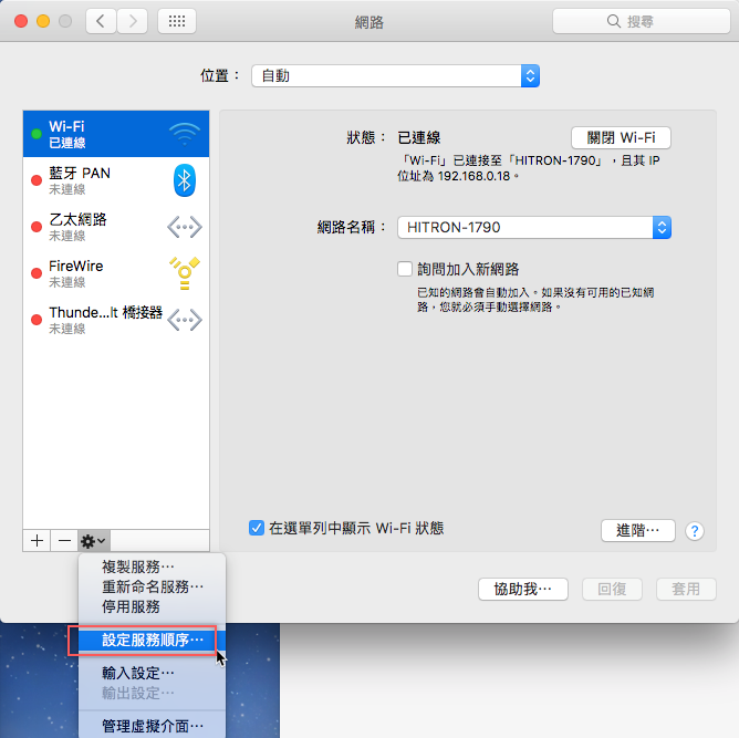 第六種,到網路設定區點開齒輪圖示,選擇「設定服務順序」。