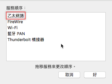 如果你的電腦同時有多種連線方式,可試著變更順序,例如將乙太網路設在第一順位,看看會不會有差別。