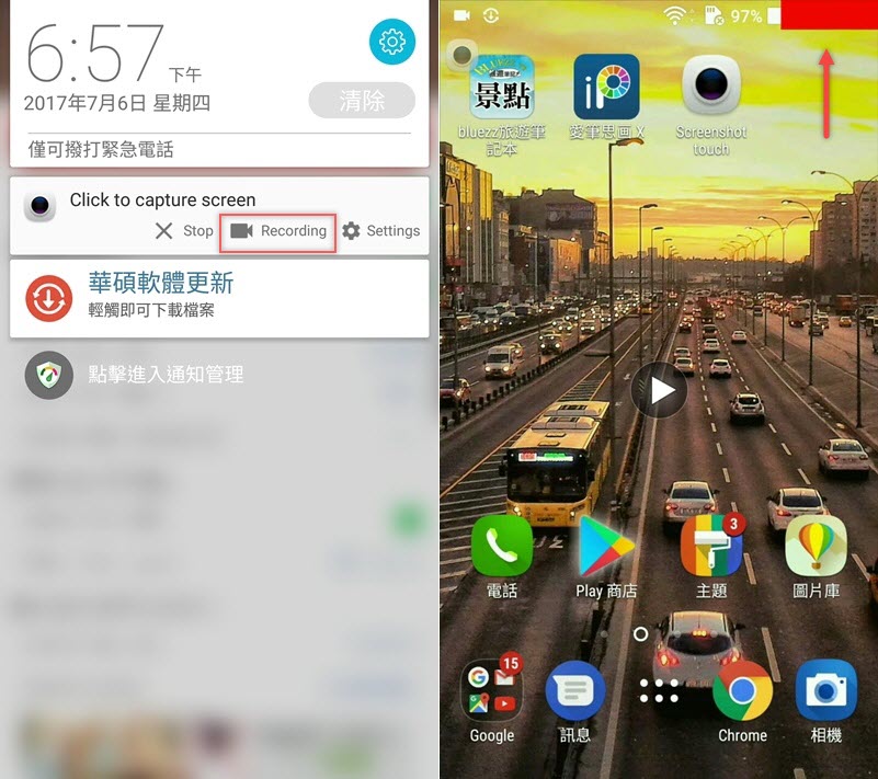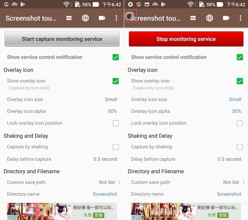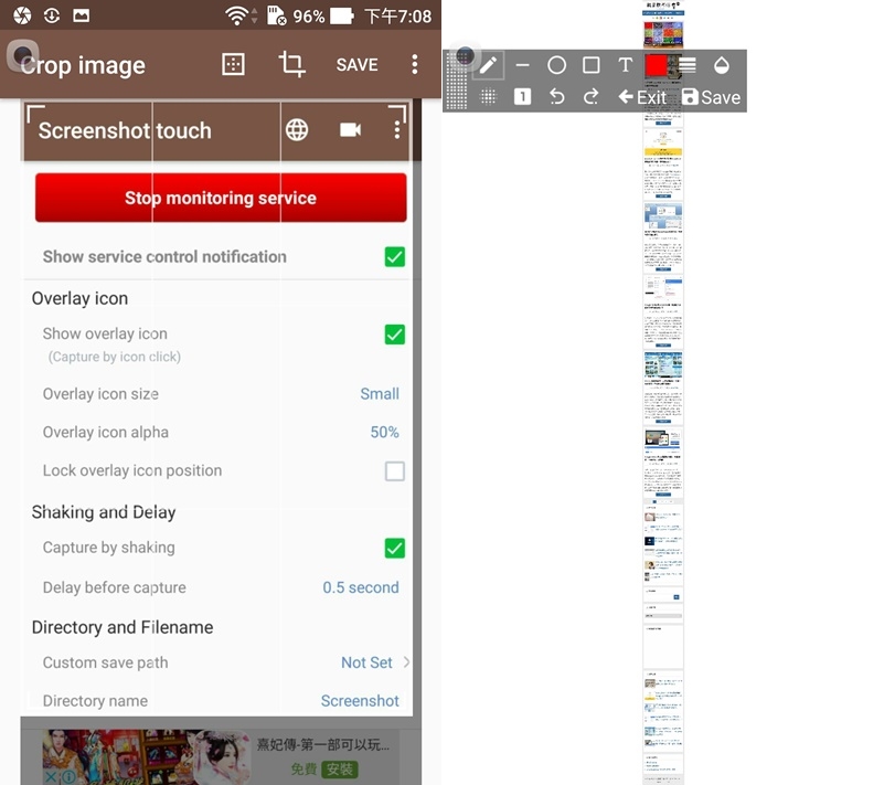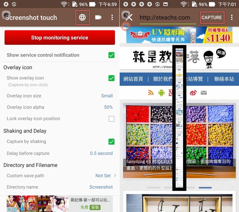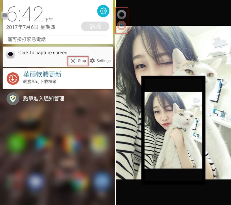 APP 會變成半透明的浮動小圖示在左上角,也可從上方狀態列滑下來控制,點它就會截圖,並收在圖片庫裡。