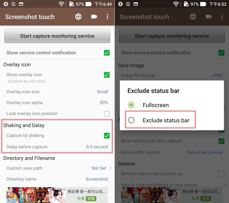 還可設定搖動截圖,選項打勾後再看要不要調整延遲時間,搖一下手機就完成了,在截圖畫面的部分也能從全螢幕改成去掉上方的狀態列。