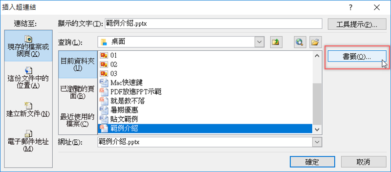 然後選擇要插入的 PPT 檔,這裡要注意的是,如果你直接插入,連結的檔案就會從首頁開始顯示,如果你希望點開連結後看到的是特定一張投影片,就要點「書籤」。