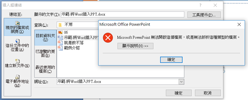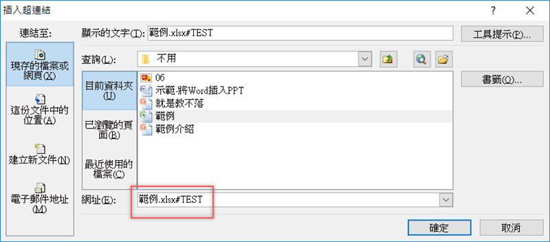 再回到 PPT 檔,選擇剛剛的那份 Word 檔之後,在檔名後面加上「# 書籤名稱」,這樣子當你開啟連結顯示的就會是剛剛插入書籤的地方。