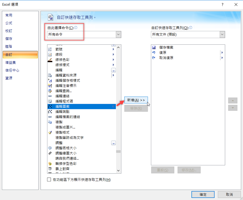 不喜歡註解視窗的形狀也能更改,左上角點開到底下「Excel 選項」,然後到自訂,選擇所有命令,再往下滑找到「編輯圖案」,大概在下面五分之一的地方,點新增。
