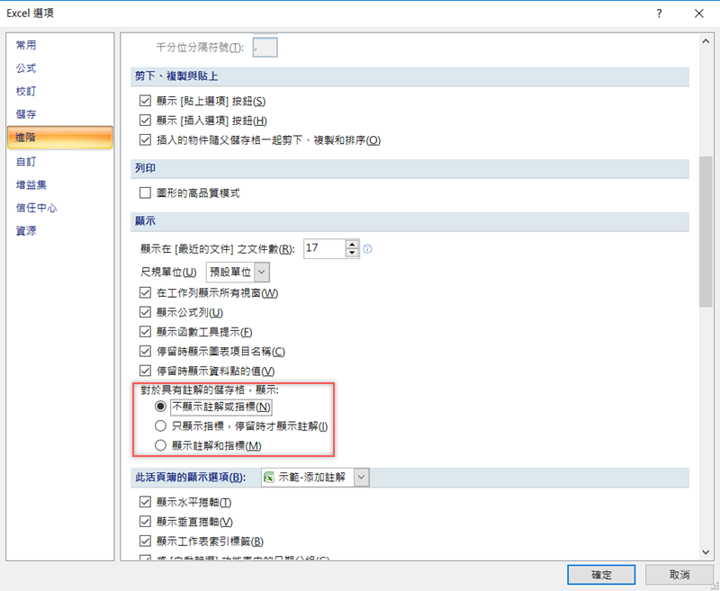註解的顯示方式也能更改,到 Excel 選項 → 進階,然後在「顯示」底下可以設定讓註解與指標完全隱藏(連紅色三角形都沒有),這樣即使你已經插入註解,但暫時不想看見,還是可以不讓它顯示出來。