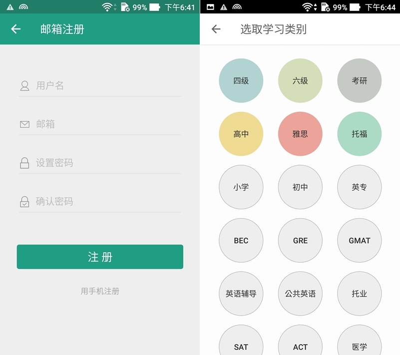 一開始要註冊一個帳戶,比較討厭的是因為是大陸開發的 APP 所以不能用電話號碼,只能選擇 Email 註冊,註冊後先選學習類別,有考研、高中、雅思、托福、GRE、公共英語等不同主題。