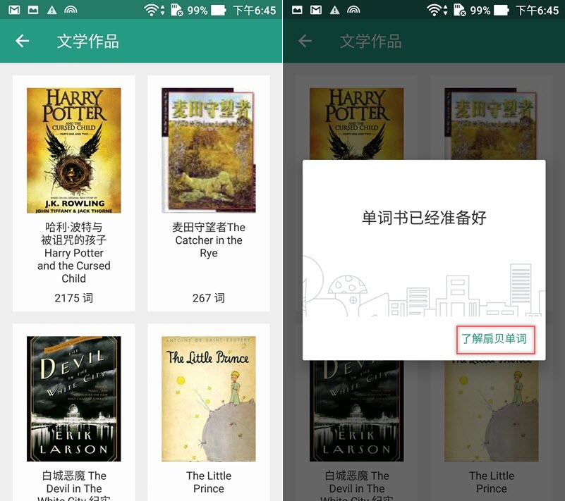先選文學作品看看,進入後挑一本書,像哈利波特共提供了 2175 個詞,匯入後點了解扇貝單詞。
