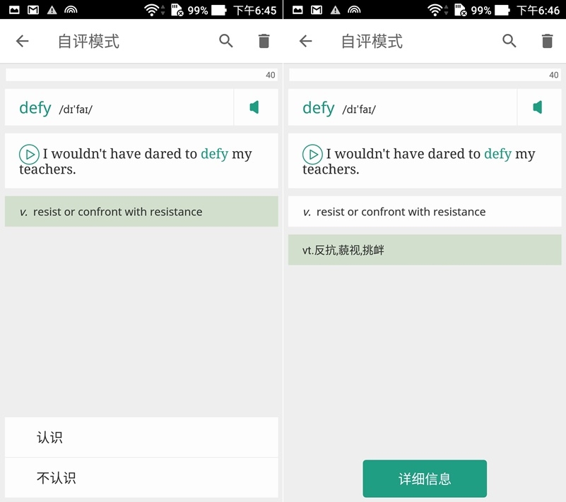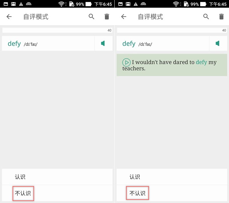 接著就會開始出現單字,如果你點「不認識」,APP 就會再給你一行提示,還是點不認識,就會繼續給你提示。