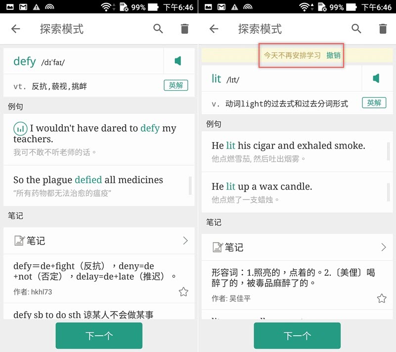 提供單字註解、發音、例句、文法等學習資源,讀過就點「下一個」,如果在步驟中點「認識」,就會直接跳到註解,並在上面顯示「今天不再學習」讓它不會再跳出來,你也可以選擇撤銷。