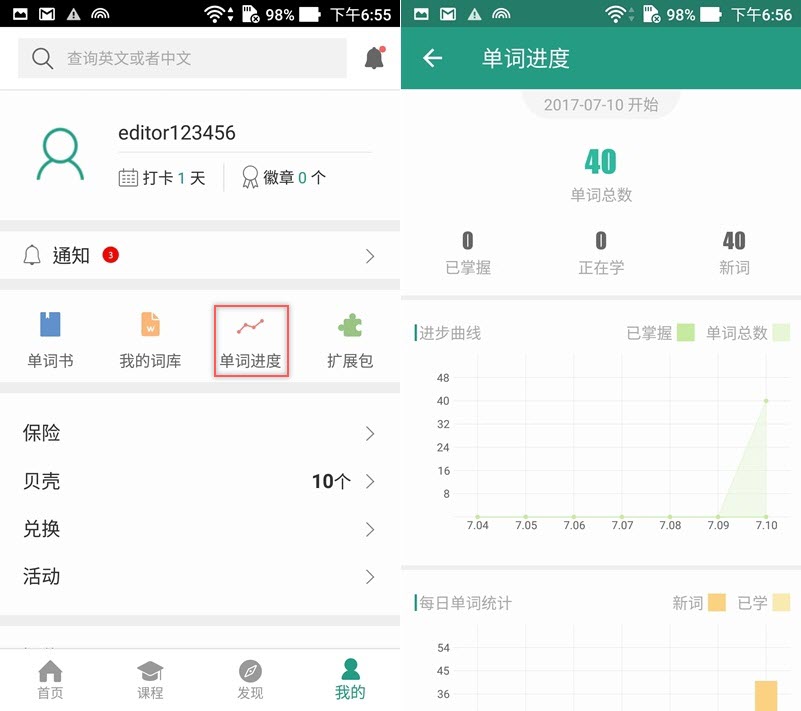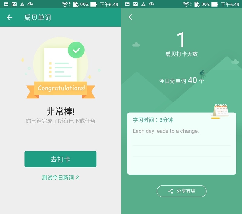 一個階段達成,共學了 40 個單字,可以馬上進入測試或打卡。