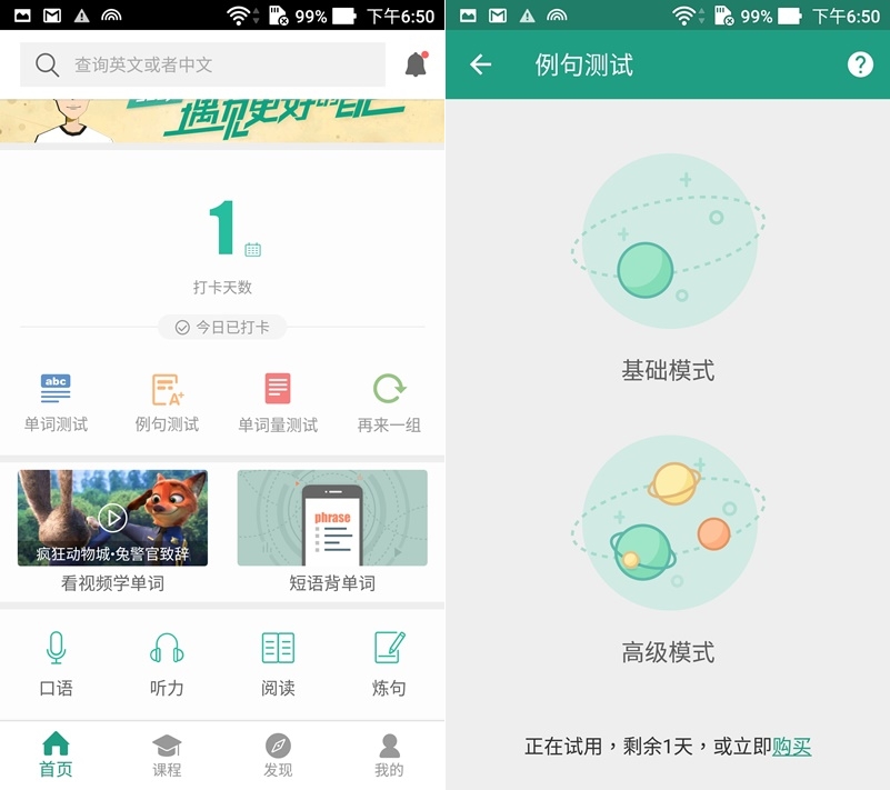 跳出後到了首頁,可繼續單詞、例句、或單詞量測試,模式也有基礎和高級可選。
