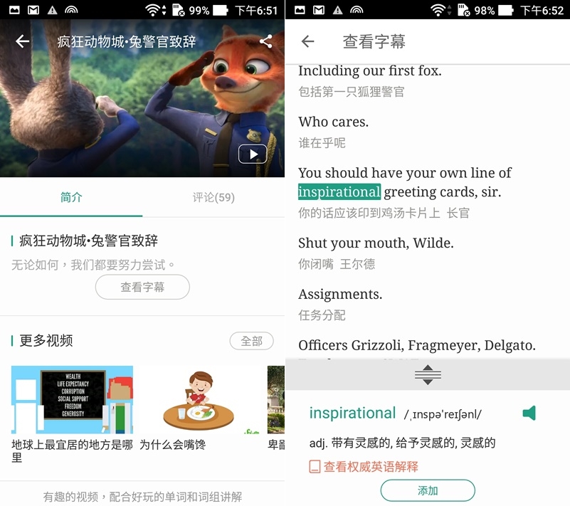 還有看視頻學單字功能,並搭配字幕,看到不熟悉的字可點擊加入單字庫。